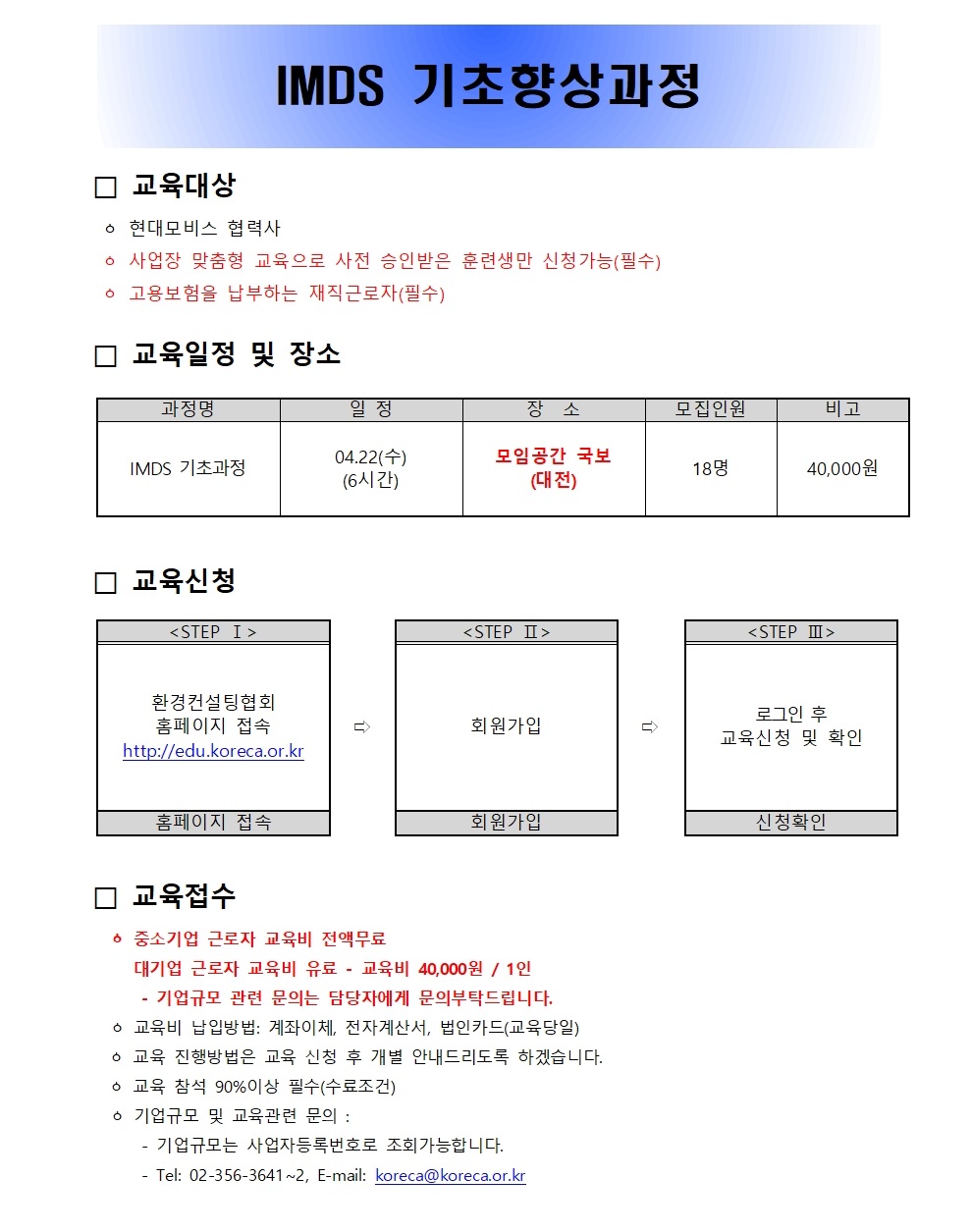 (사)한국환경컨설팅협회는 2011년부터 기업 재직자를 대상으로 환경교육을 실시하고 있습니다. 환경컨설팅 및 환경 산업체 담당자의 실무능력을 향상시키기 위한 목적으로 기후변화대응 최근 환경이슈 및 정책을 반영한 심도깊은 교육을 실시하오니, 교육에 많은 참여를 바랍니다.