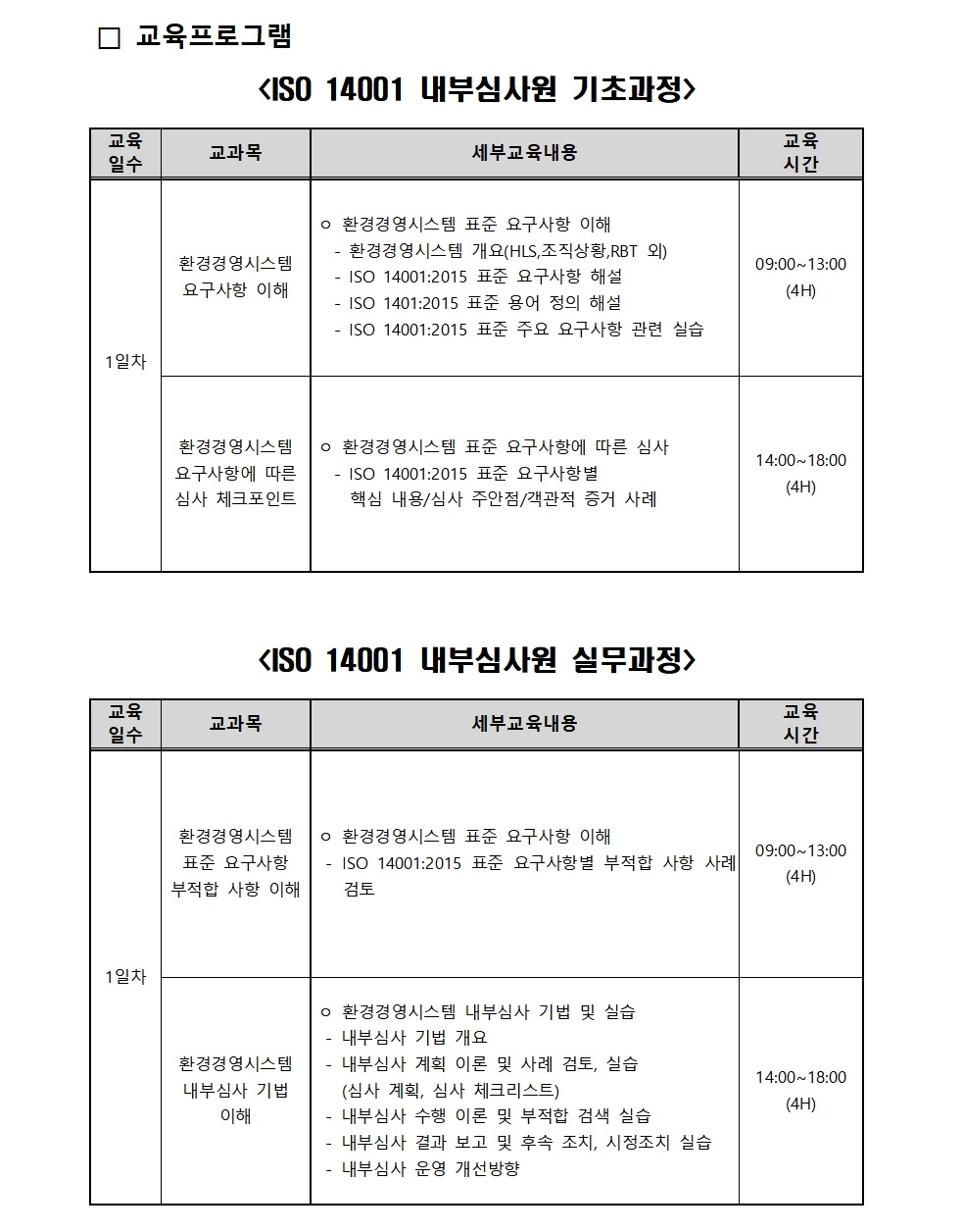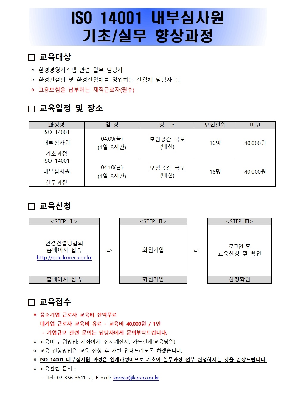 사)한국환경컨설팅협회는 2011년부터 기업 재직자를 대상으로 환경교육을 실시하고 있습니다. 환경컨설팅 및 환경 산업체 담당자의 실무능력을 향상시키기 위한 목적으로 기후변화대응 최근 환경이슈 및 정책을 반영한 심도깊은 교육을 실시하오니, 교육에 많은 참여를 바랍니다.