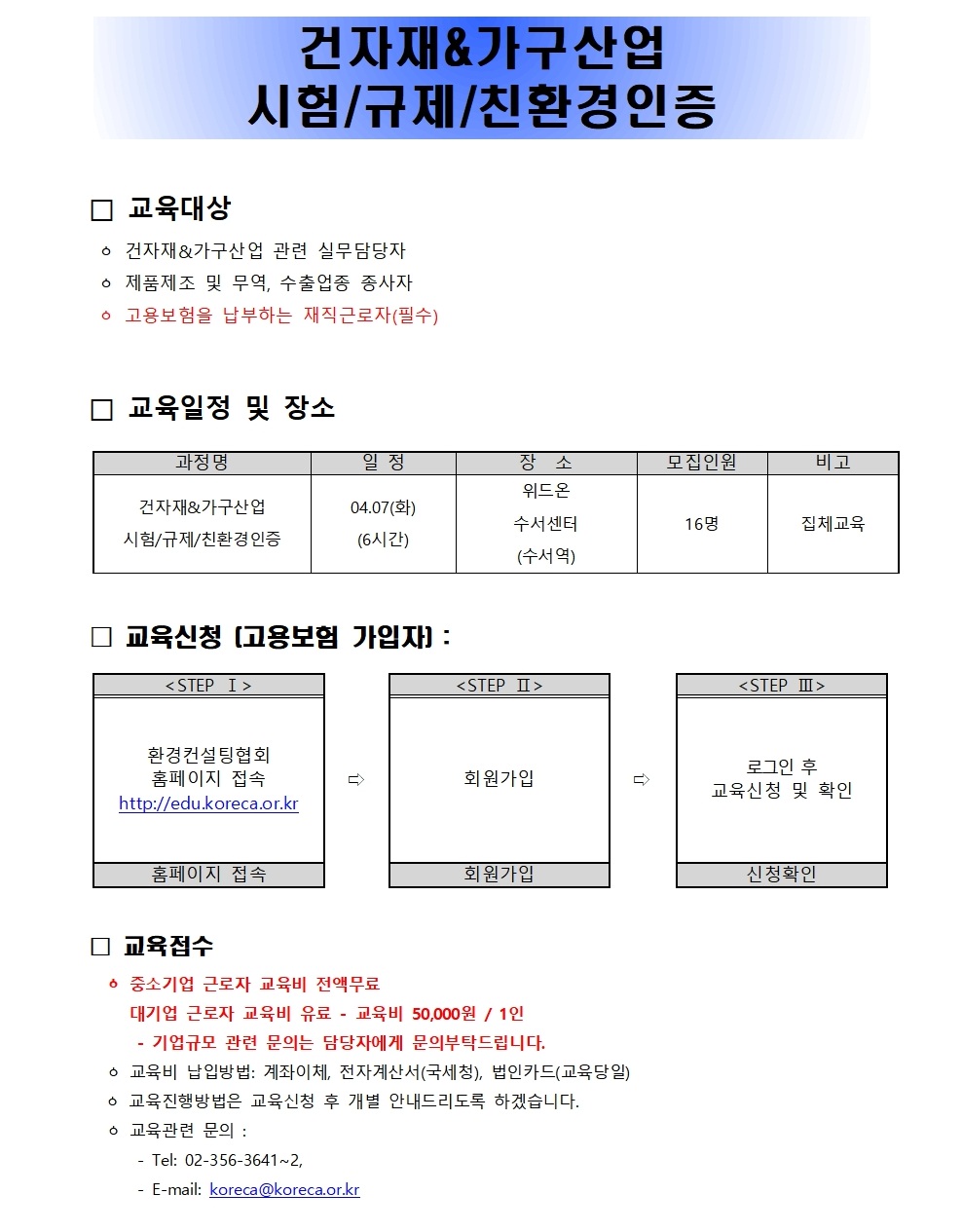 (사)한국환경컨설팅협회는 2011년부터 기업 재직자를 대상으로 환경교육을 실시하고 있습니다. 환경컨설팅 및 환경 산업체 담당자의 실무능력을 향상시키기 위한 목적으로 기후변화대응 최근 환경이슈 및 정책을 반영한 심도깊은 교육을 실시하오니, 교육에 많은 참여를 바랍니다.