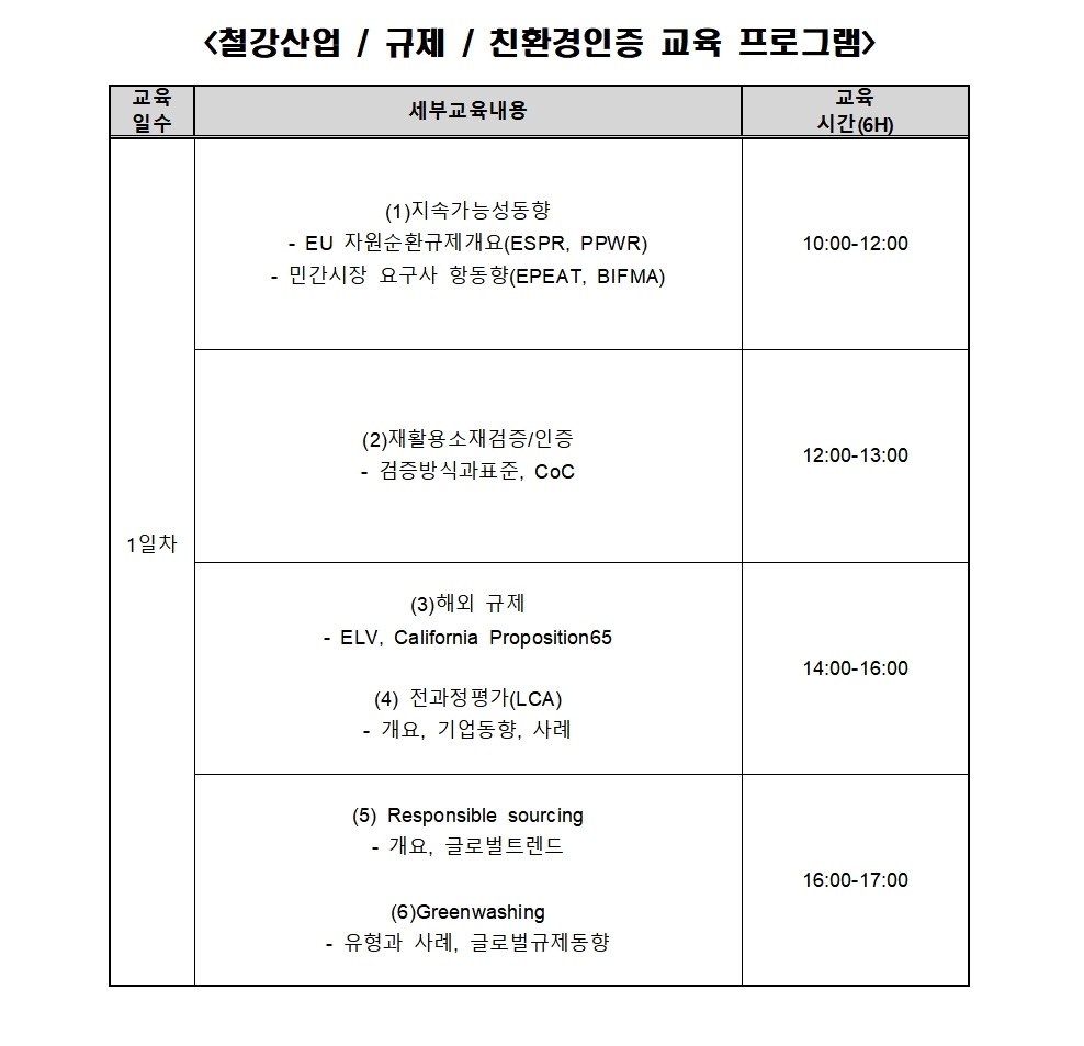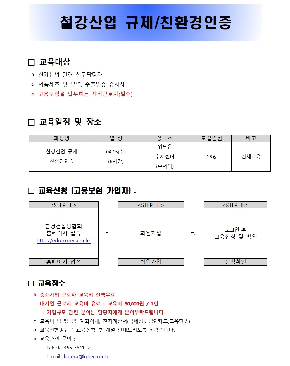 (사)한국환경컨설팅협회는 2011년부터 기업 재직자를 대상으로 환경교육을 실시하고 있습니다. 환경컨설팅 및 환경 산업체 담당자의 실무능력을 향상시키기 위한 목적으로 기후변화대응 최근 환경이슈 및 정책을 반영한 심도깊은 교육을 실시하오니, 교육에 많은 참여를 바랍니다.